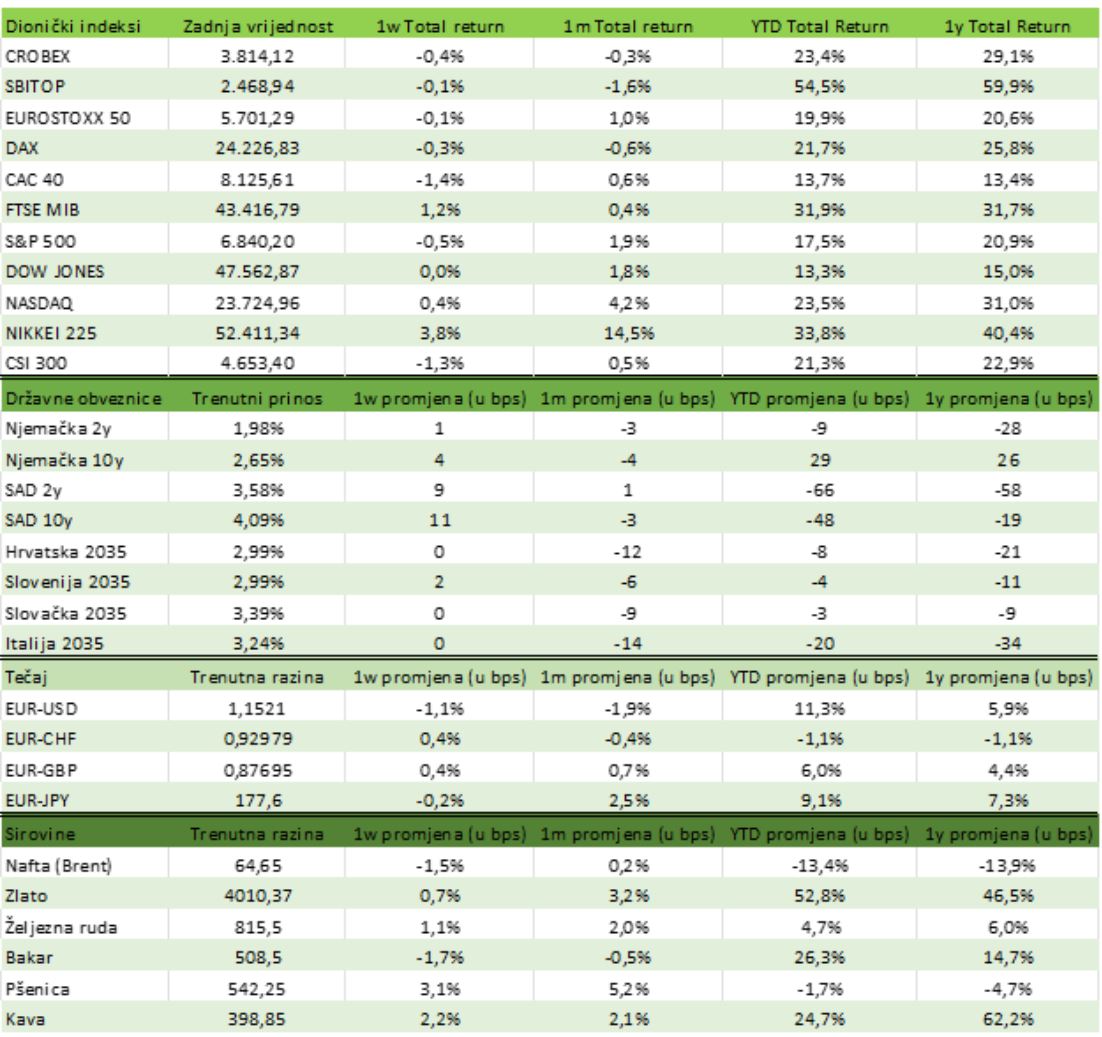 Na Zagrebačkoj burzi glavni indeksi zabilježili su pad: CROBEX je tjedan završio s padom od 0,73%, a CROBEX10 od 1,77%. Kretanja sektorskih indeksa bila su mješovita, s rasponom od -1,87% za CROBEXnutris do +3,48% za CROBEXkonstrukt. Među najlikvidnijim dionicama izdvajaju se AD Plastik s rastom od 16,7% te Podravka s padom od 4,6%. Većina kompanija objavila je rezultate za prvih devet mjeseci, uz stabilne trendove profitabilnosti. Otvoren je kontejnerski terminal Rijeka Gateway, investicija vrijedna 380 milijuna eura, koja Hrvatsku dodatno pozicionira kao važno prometno čvorište u regiji. Uz to, Dalekovod je sklopio ugovor vrijedan više od 100 milijuna eura za izgradnju dalekovoda u Švedskoj, dok je KONČAR potpisao sporazum o razvoju sustava protudronske zaštite za Ministarstvo obrane u vrijednosti od 125 milijuna eura.