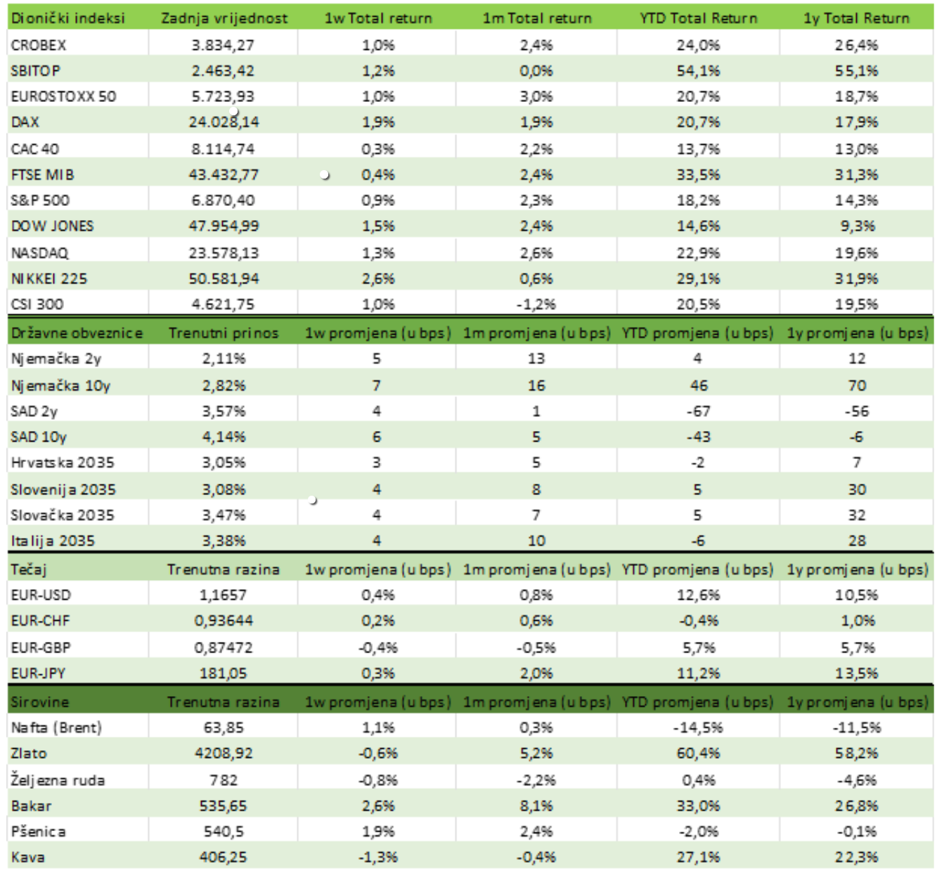 Na Zagrebačkoj burzi dionički indeksi porasli su tijekom tjedna: CROBEX je ojačao 1%, a CROBEX10 1,3%. Najvažniji događaj bila je prodaja gotovo 36 tisuća dionica Končar-elektroindustrije za oko 23 milijuna eura, koju su izveli obvezni mirovinski fondovi PBZ Croatia osiguranje putem ubrzane prodaje (ABB) organizirane od strane InterCapitala po cijeni od 650 eura po dionici, oko 20 eura niže od tržišne cijene. Valamar Grupa najavila je kapitalne investicije od 245 milijuna eura za 2026., uglavnom u nove hotelske kapacitete, rekonstrukcije i projekte visokog standarda u Poreču, Makarskoj i na Rabu. Končar je potpisao dva nova ugovora s INA-om vrijedna ukupno 33,4 milijuna eura za projekte vezane uz proizvodnju zelenog vodika i izgradnju solarne elektrane.