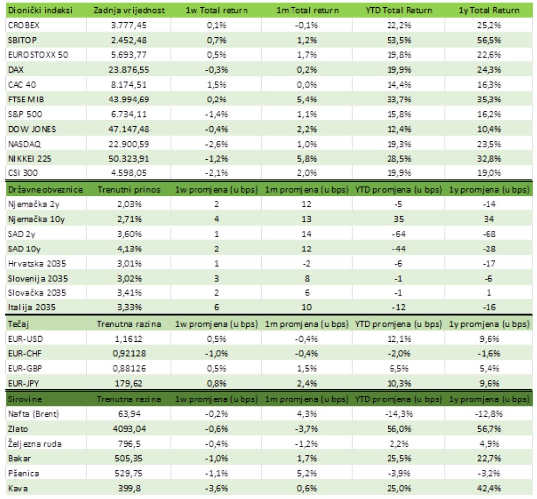 Na Zagrebačkoj burzi tjedan je donio umjereno pozitivan pomak.. CROBEX je završio s tjednim rastom od 0,84% i zaključio na 3.777,45 bodova, dok je CROBEX10 zabilježio tjedni rast od 0,63% i završio na 2.402,86 bodova. Rezultati kompanija za prvih devet mjeseci vrlo su snažni, pri čemu je 16 od 20 kompanija iz indeksa ostvarilo pozitivne rezultate. Među kompanijama s nešto slabijim rezultatima nalaze se 2 banke, što ne iznenađuje s obzirom na to da je 2024. bila rekordna godina za njih. Multiplikatori domaćeg tržišta i dalje su na povoljnijim razinama u odnosu na razvijena tržišta.