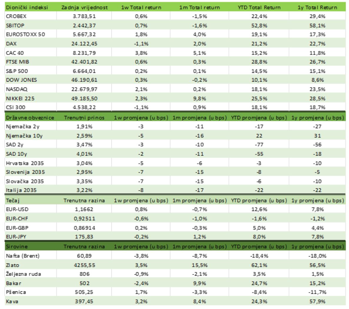 Europski dionički indeksi završili su tjedan mješovito. Njemački DAX oslabio je za 1,7% (19,7% YTD), dok je francuski CAC 40 snažno porastao 3,3% (14,4% YTD). Talijanski FTSE MIB blago je pao 0,7% (26,9% YTD), a britanski FTSE 100 smanjio se 0,7% (17,9% YTD). Euro je ojačao prema američkom dolaru te tjedan završio na 1,17 EUR/USD, u odnosu na 1,16 tjedan ranije.