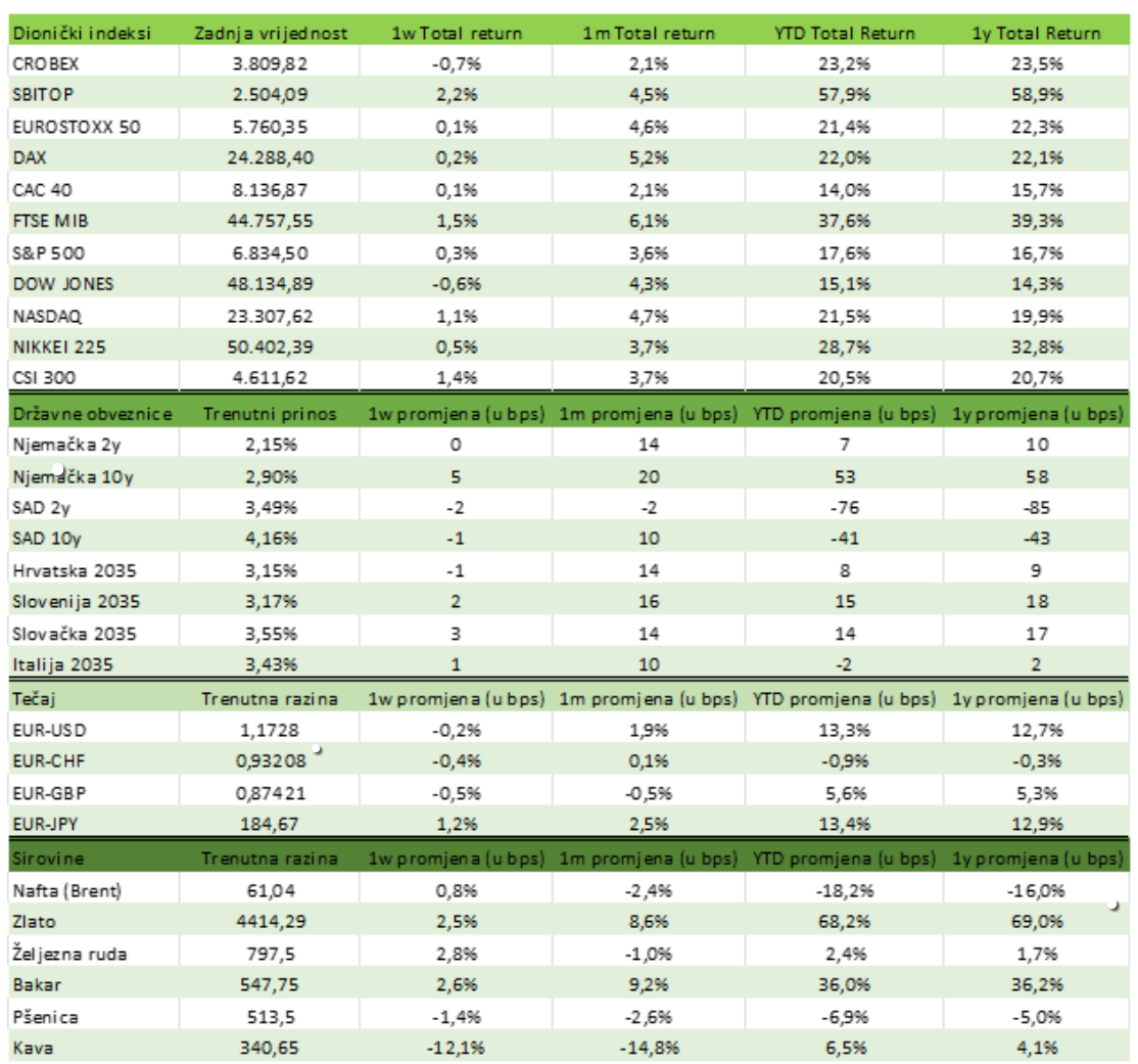 Na tržištima kapitala tjedan je obilježila povišena volatilnost. Glavni dionički indeksi na Wall Streetu proteklog su tjedna zabilježili mješovite izvedbe. S&P 500 porastao je za 0,1%, Nasdaq za 0,5%, dok je Dow Jones pao za 0,7%. Nakon slabosti tehnološkog sektora početkom tjedna zbog zabrinutosti oko troškova ulaganja u umjetnu inteligenciju, burze su krajem tjedna ostvarile oporavak potaknut slabijim inflacijskim podacima i jačanjem očekivanja da bi FED u idućim mjesecima mogao nastaviti snižavanje kamatnih stopa. Unatoč kratkoročnim oscilacijama, američko tržište dionica ostaje snažno u 2025. godini, s dvoznamenkastim prinosima glavnih indeksa od početka godine.