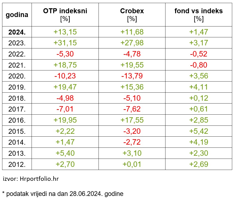 OTP indeksni fond pokrenut je u prosincu 2007. godine i ulaže u sastavnice Crobexa koje možete pronaći na linku. Minimalna prva uplata u OTP indeksni je 3000,00 kn, a svaka sljedeća 300,00 kuna, što znači da za znatno manje uloženog novca možete imati portfelj identičan indeksu Crobex, te da netko stručan upravlja portfeljem fonda. U vrijednost fonda također su uključene i dividende koje kompanije isplaćuju te se ta sredstva reinvestiraju i na taj način povećavaju vrijednost početne investicije.