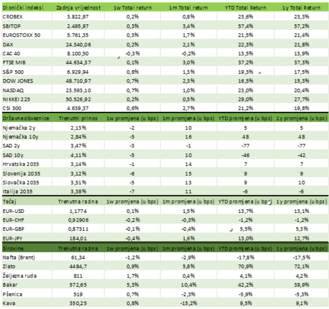 U vrlo skraćenom tjednu trgovanja, CROBEX je porastao 0,3%, dok je CROBEX10 ojačao 0,6%. Na godišnjoj razini, domaće tržište kapitala ostvarilo je snažne prinose, pri čemu je Crobex na YTD bazi porastao 19,8%, potvrđujući izrazito povoljnu godinu za hrvatske dionice.